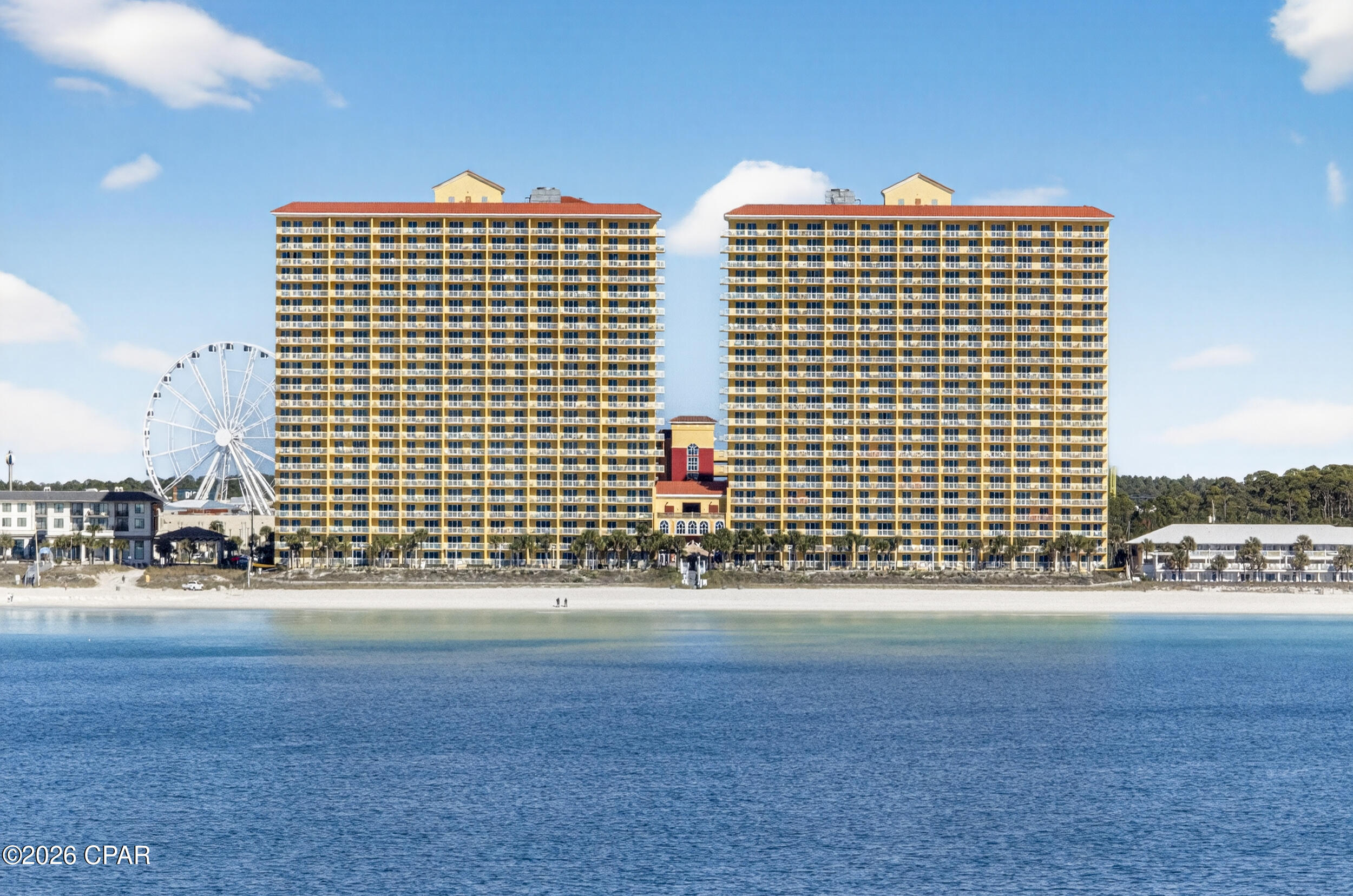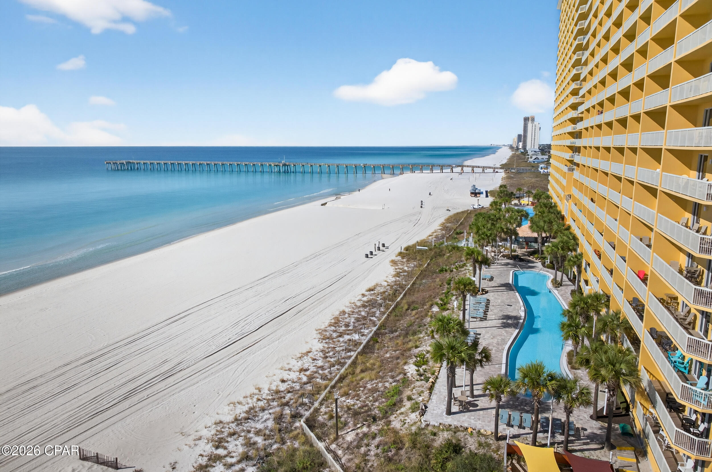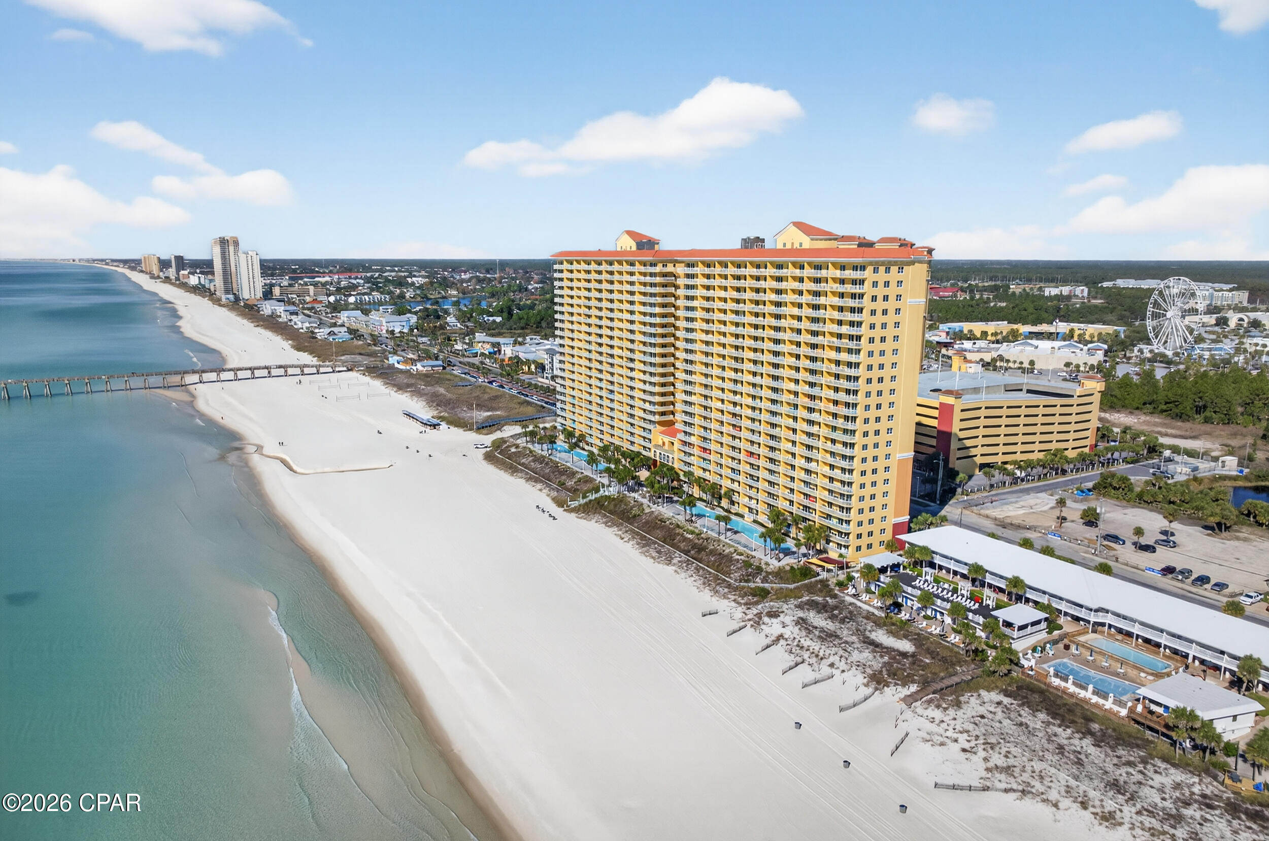 Enjoy breathtaking gulf views, a desirable floor plan, and exceptional resort amenities in this 2BR/2BA+BUNKS at Calypso. Perfect for short-term rentals or as a vacation home, this spacious getaway features a gulf-front primary suite with balcony access and a bonus bunk room that gives it the feel of a 3-bedroom unit. High above the crowds, you'll appreciate the peaceful privacy, gorgeous water vistas, and relaxing sounds of the surf - all while being just steps away from the area's top attractions. Inside, durable tile flooring runs throughout, ideal for beach living and effortless upkeep. The open living and dining areas are filled with natural light, with floor-to-ceiling sliding glass doors that lead out to your private balcony where the views stretch for miles. The fully-stocked kitchen features granite countertops and brand new stainless steel appliances. A walk-in laundry room and wet bar adds extra convenience. Full furnished and rental ready, this condo comfortably sleeps 8 guests. Calypso Resort offers more than just a place to stay. Spend days lounging by one of the two beachfront pools, grabbing a drink at the tiki bar, or working out at the fitness center. And when you're ready to explore, Pier Park, with its vast offering of dining, shopping and entertainment, is right across the street. New attractions like Topgolf and Dolly Parton's pirate-themed dinner theater will also being more excitement to the area when they open this year. Its location puts everything within easy reach. This condo is a great opportunity for someone looking to own in one of Panama City Beach's favorite resorts - come take a look and see why Calypso remains a top pick year after year.
