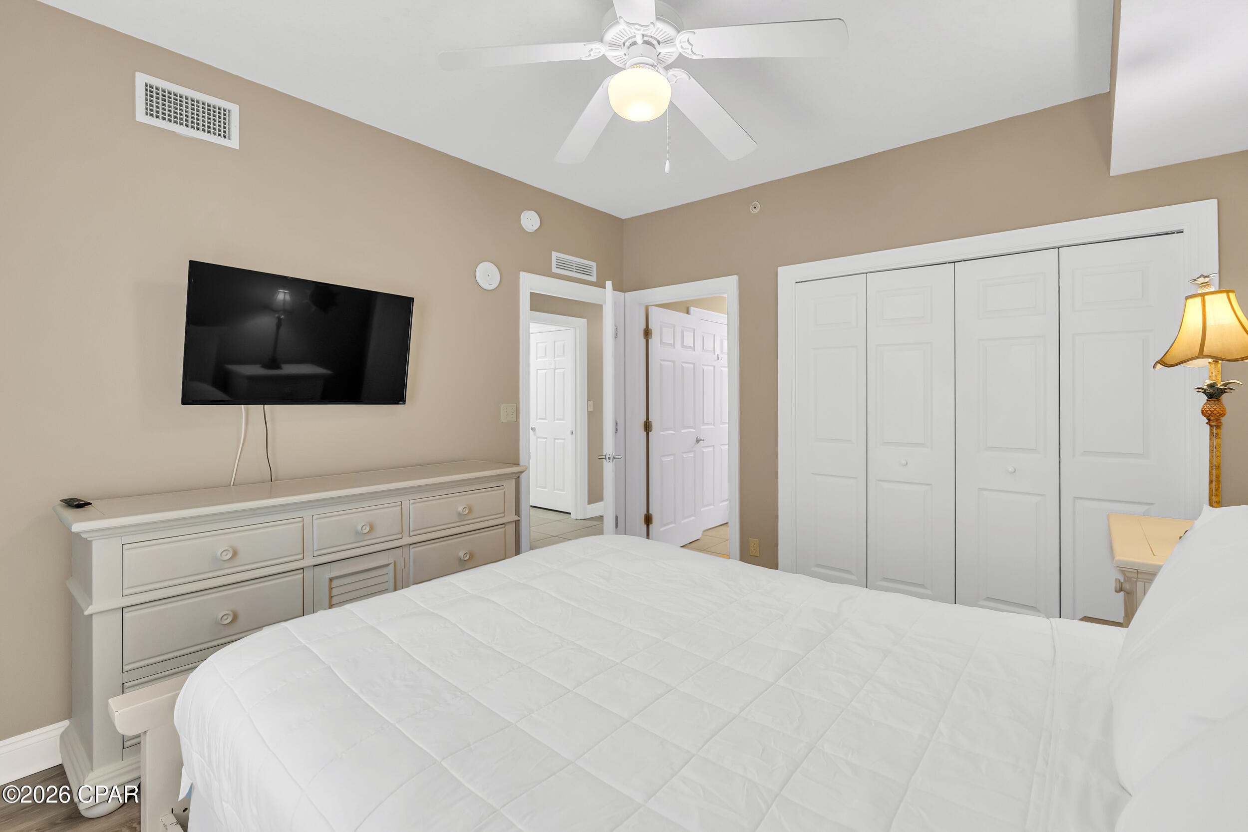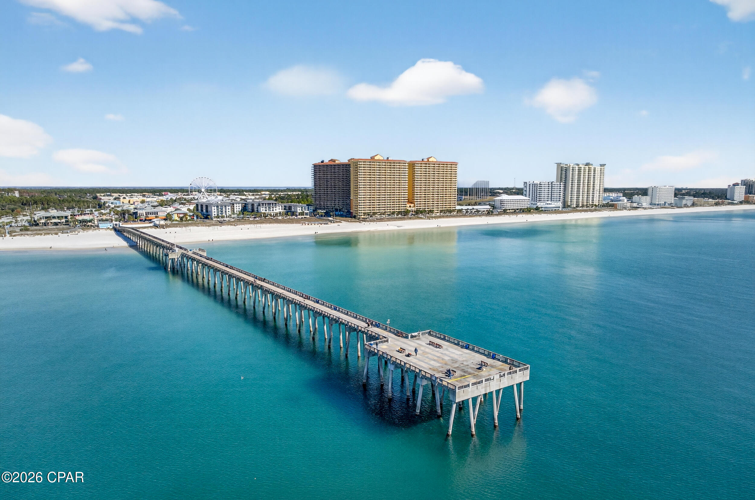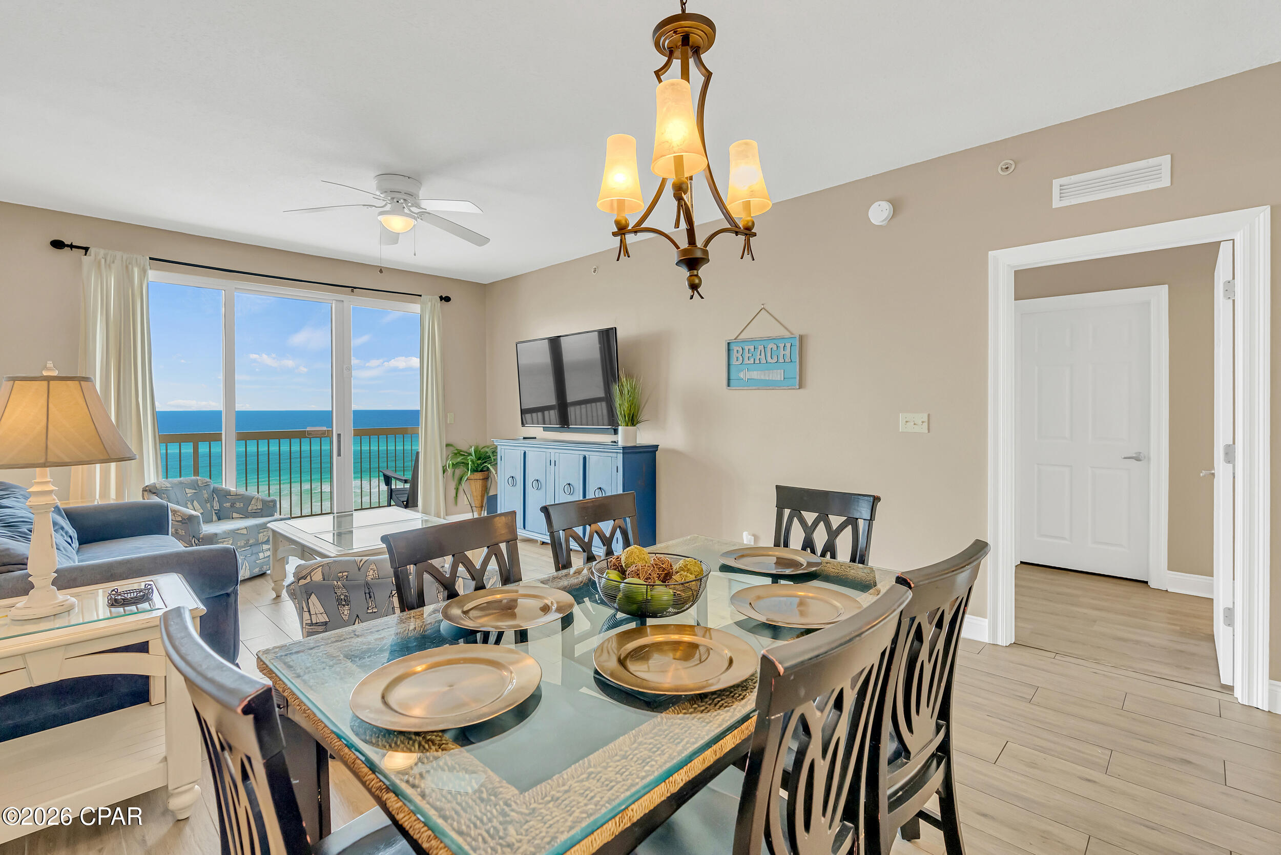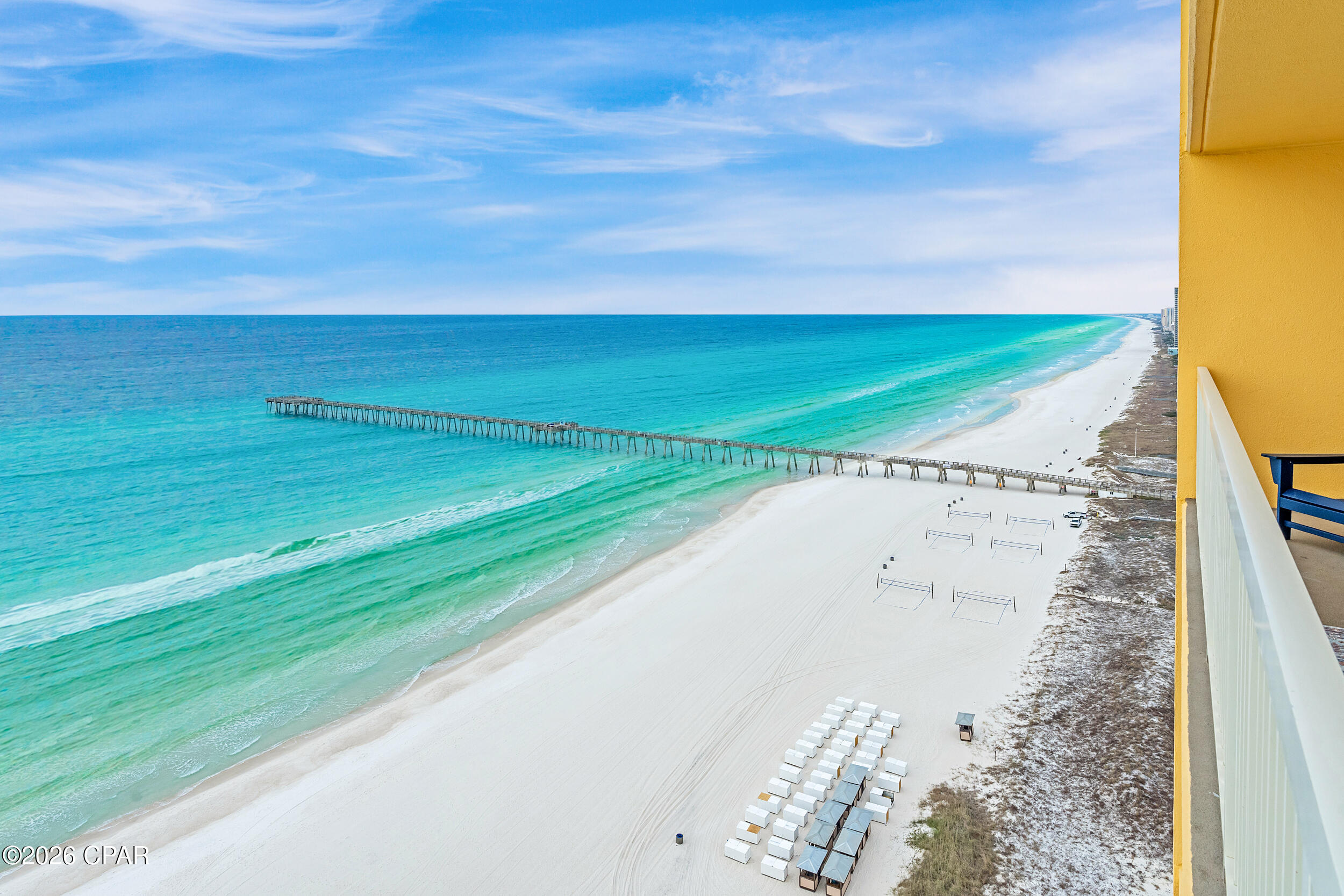 Enjoy breathtaking gulf views, a desirable floor plan, and exceptional resort amenities in this 2BR/2BA+BUNKS at Calypso. Perfect for short-term rentals or as a vacation home, this spacious getaway features a gulf-front primary suite with balcony access and a bonus bunk room that gives it the feel of a 3-bedroom unit. High above the crowds, you'll appreciate the peaceful privacy, gorgeous water vistas, and relaxing sounds of the surf - all while being just steps away from the area's top attractions. Inside, durable tile flooring runs throughout, ideal for beach living and effortless upkeep. The open living and dining areas are filled with natural light, with floor-to-ceiling sliding glass doors that lead out to your private balcony where the views stretch for miles. The fully-stocked kitchen features granite countertops and brand new stainless steel appliances. A walk-in laundry room and wet bar adds extra convenience. Full furnished and rental ready, this condo comfortably sleeps 8 guests. Calypso Resort offers more than just a place to stay. Spend days lounging by one of the two beachfront pools, grabbing a drink at the tiki bar, or working out at the fitness center. And when you're ready to explore, Pier Park, with its vast offering of dining, shopping and entertainment, is right across the street. New attractions like Topgolf and Dolly Parton's pirate-themed dinner theater will also being more excitement to the area when they open this year. Its location puts everything within easy reach. This condo is a great opportunity for someone looking to own in one of Panama City Beach's favorite resorts - come take a look and see why Calypso remains a top pick year after year.