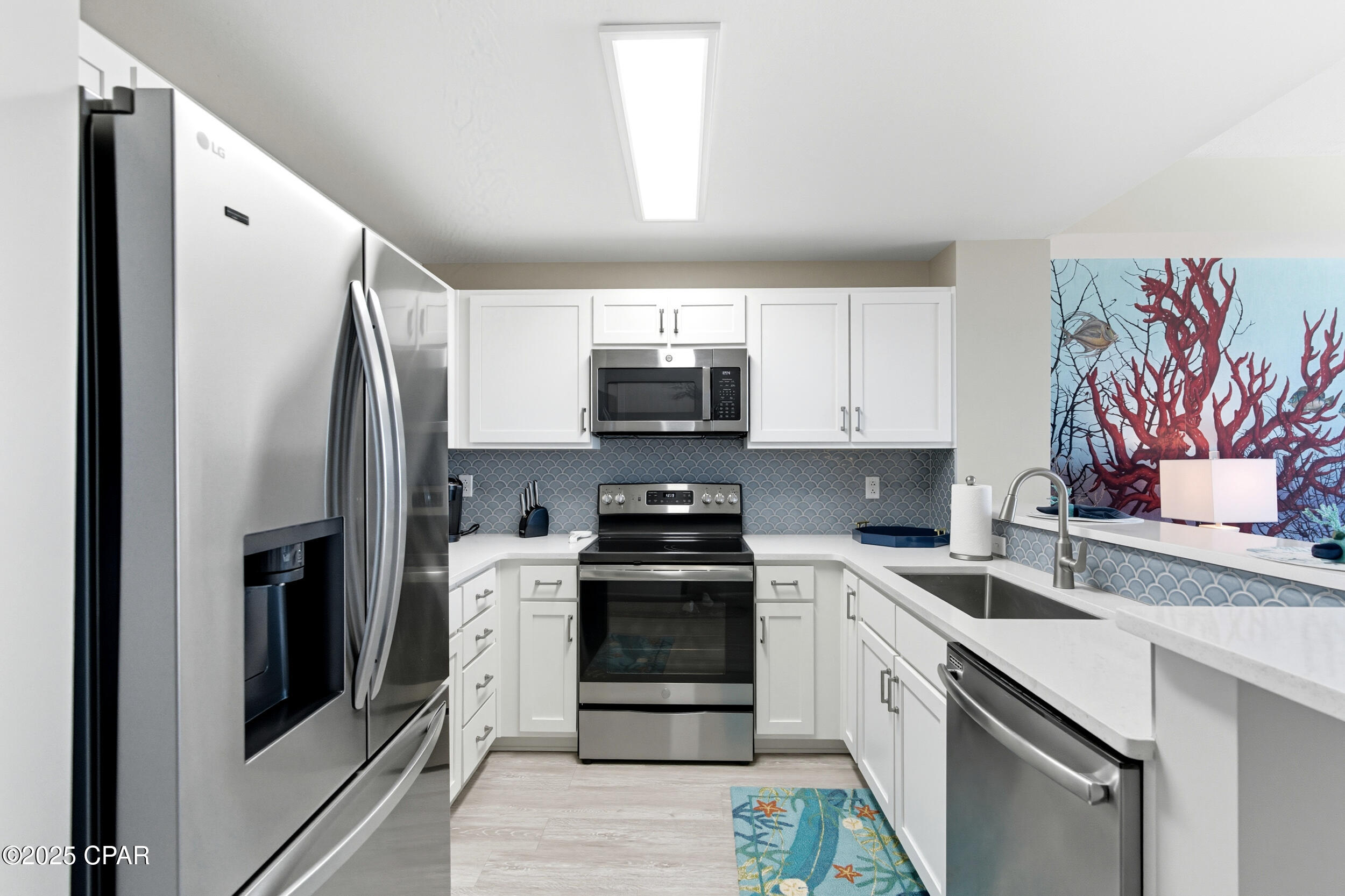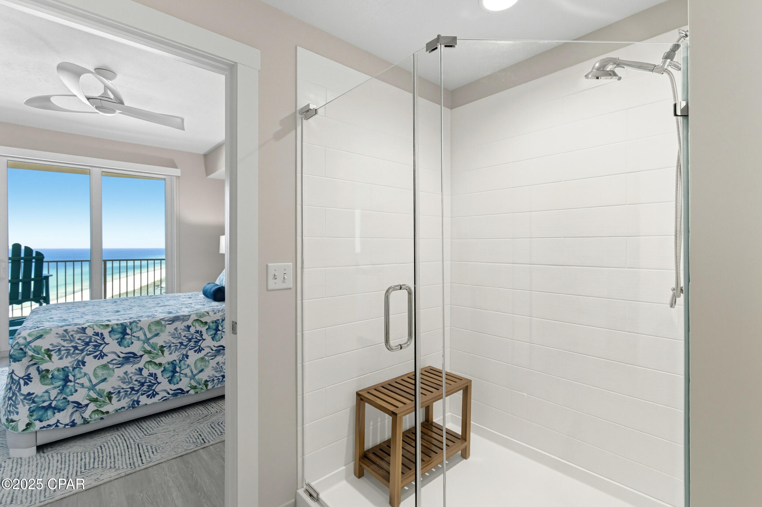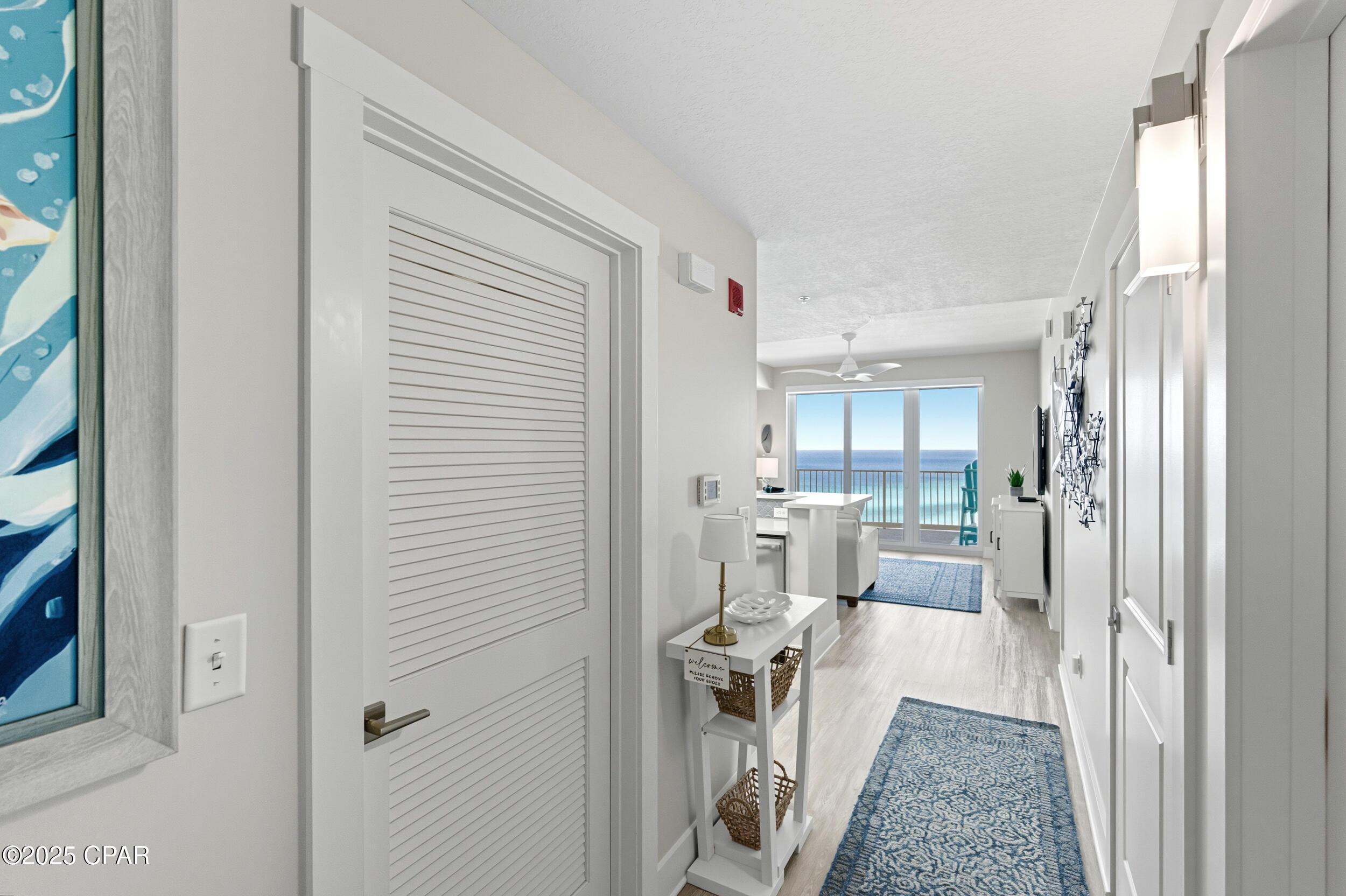 Floor-to-ceiling glass doors fill the open-concept kitchen and living area with natural light and lead to a spacious, rounded 10-ft balcony - one of the largest in PCB - perfect for sunset watching or enjoying morning coffee above the surf. Inside, EVP flooring runs throughout for effortless upkeep and lasting style. The modern kitchen features quartz countertops, a scalloped tile backsplash, and stainless appliances. A custom coral reef mural in the living area adds a touch of playful coastal character. The Gulf-view primary suite also features a sliding glass door that opens directly to the balcony. Both bathrooms have updated walk-in showers. Previously owner-occupied and meticulously maintained, this condo is offered fully furnished with tasteful coastal decor and is ready for rental or personal use.