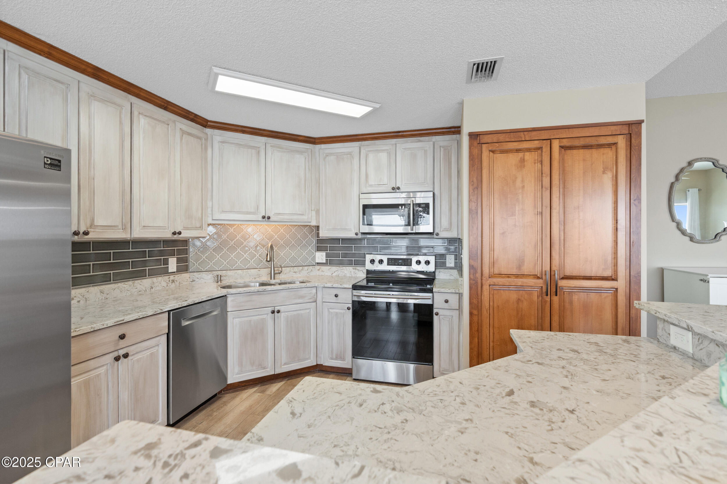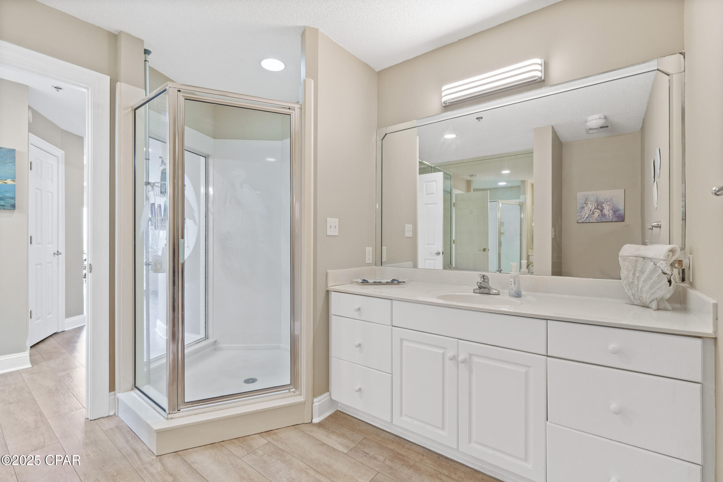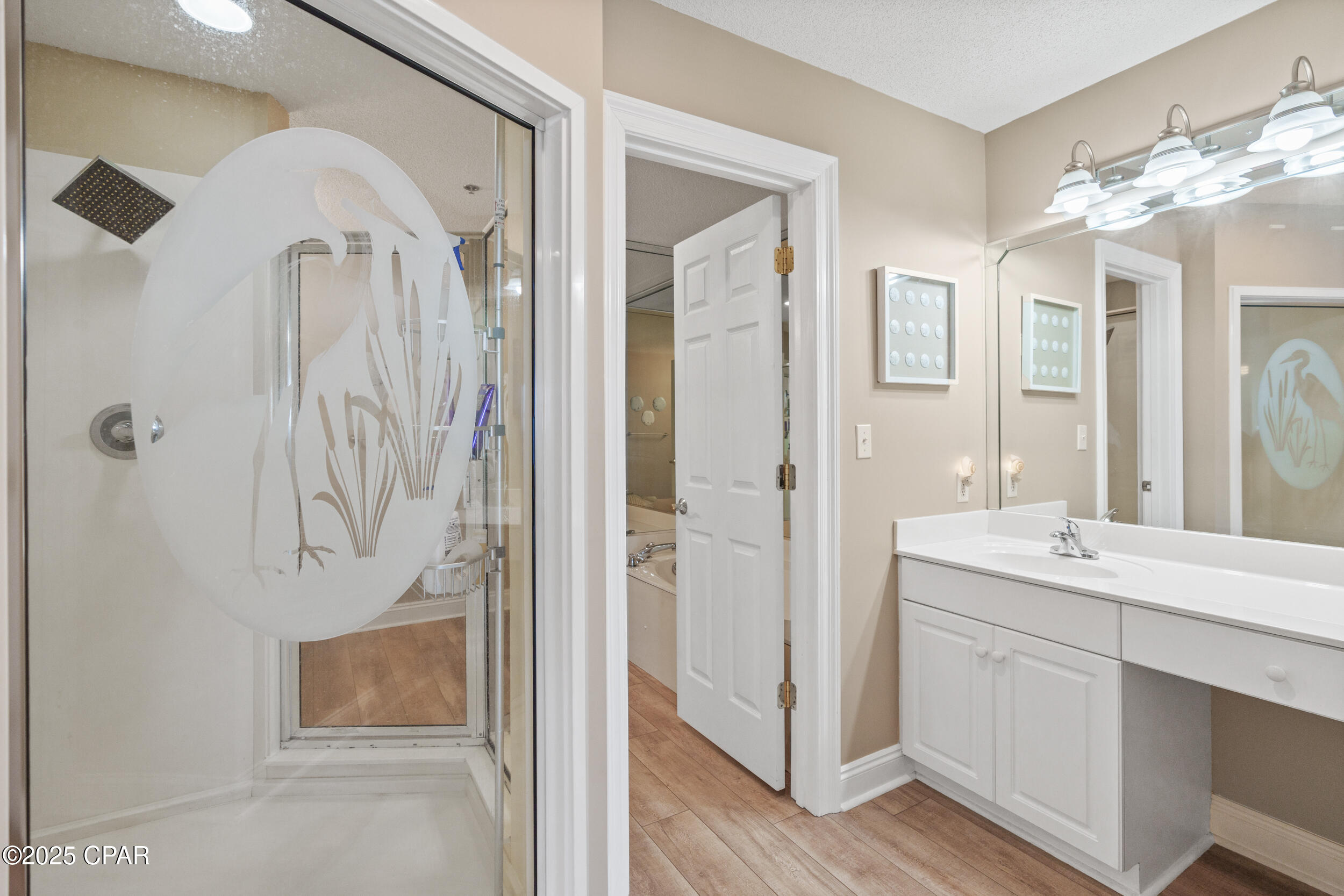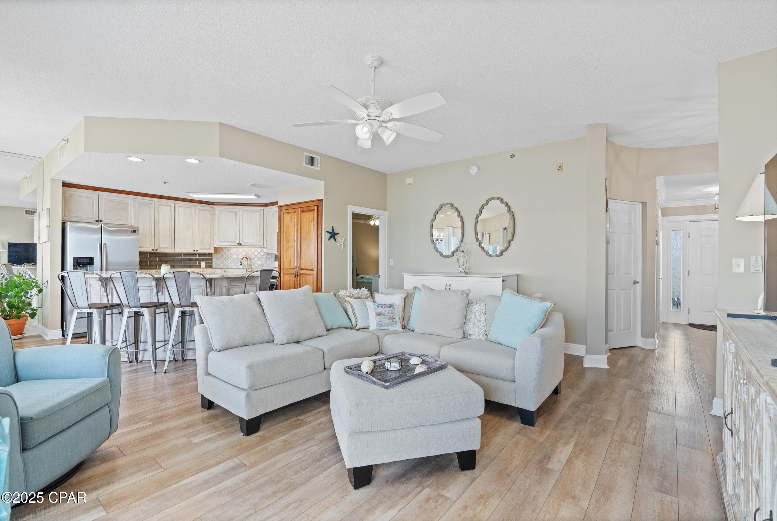 The open living and dining area is bright and roomy, flowing right out to a big balcony where you can enjoy your morning coffee, watch the sunset, or hang out with family and friends. The kitchen has modern appliances, plenty of cabinets, and a layout that makes cooking or hosting easy. The master suite is your own private getaway, with balcony access, big bay views, a walk-in closet, and a spa-style bathroom with double sinks, a soaking tub, and separate shower. An additional bedroom with its own en-suite bath--also accessible from the hallway--offers comfort and convenience for family or guests.