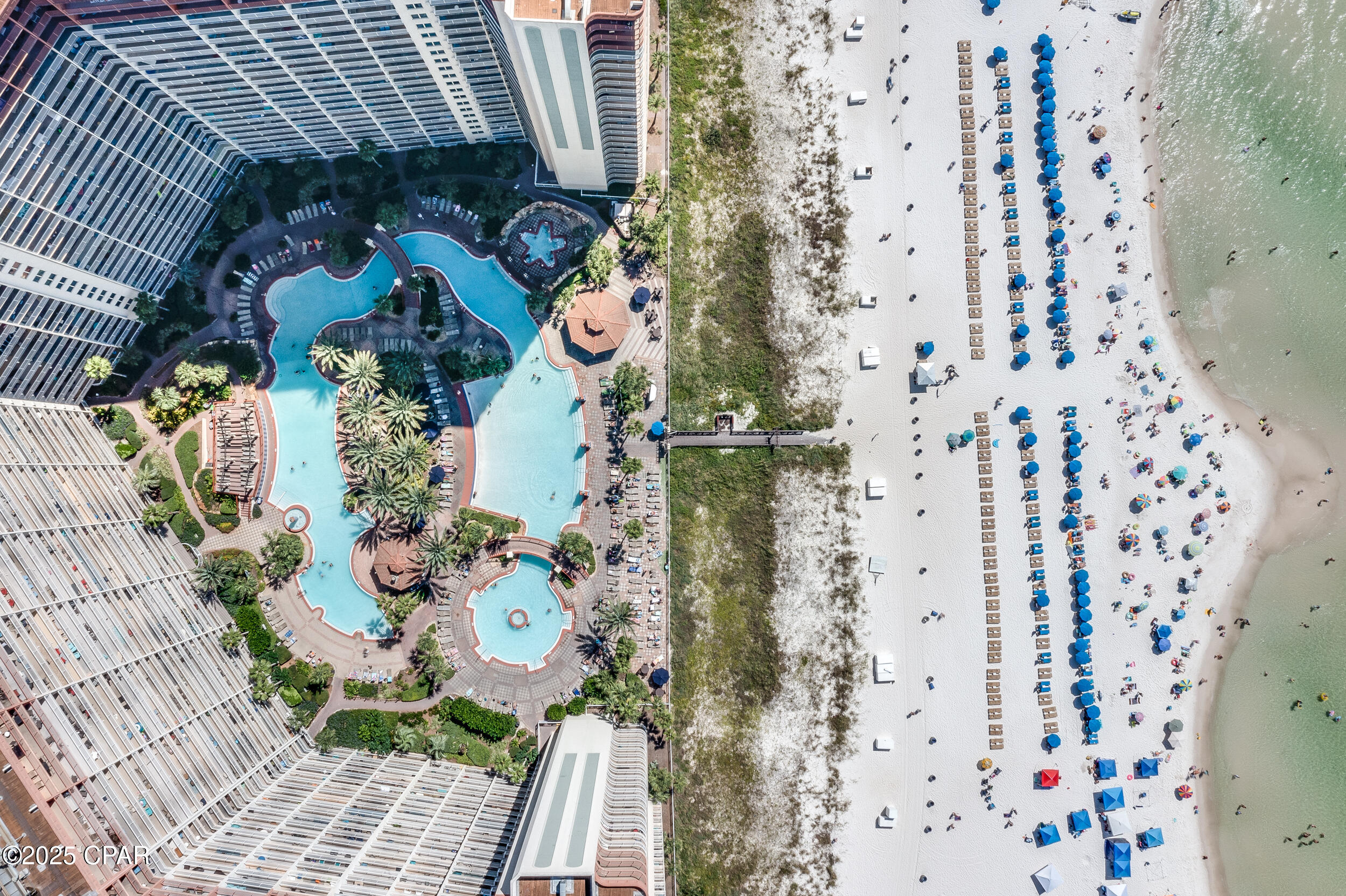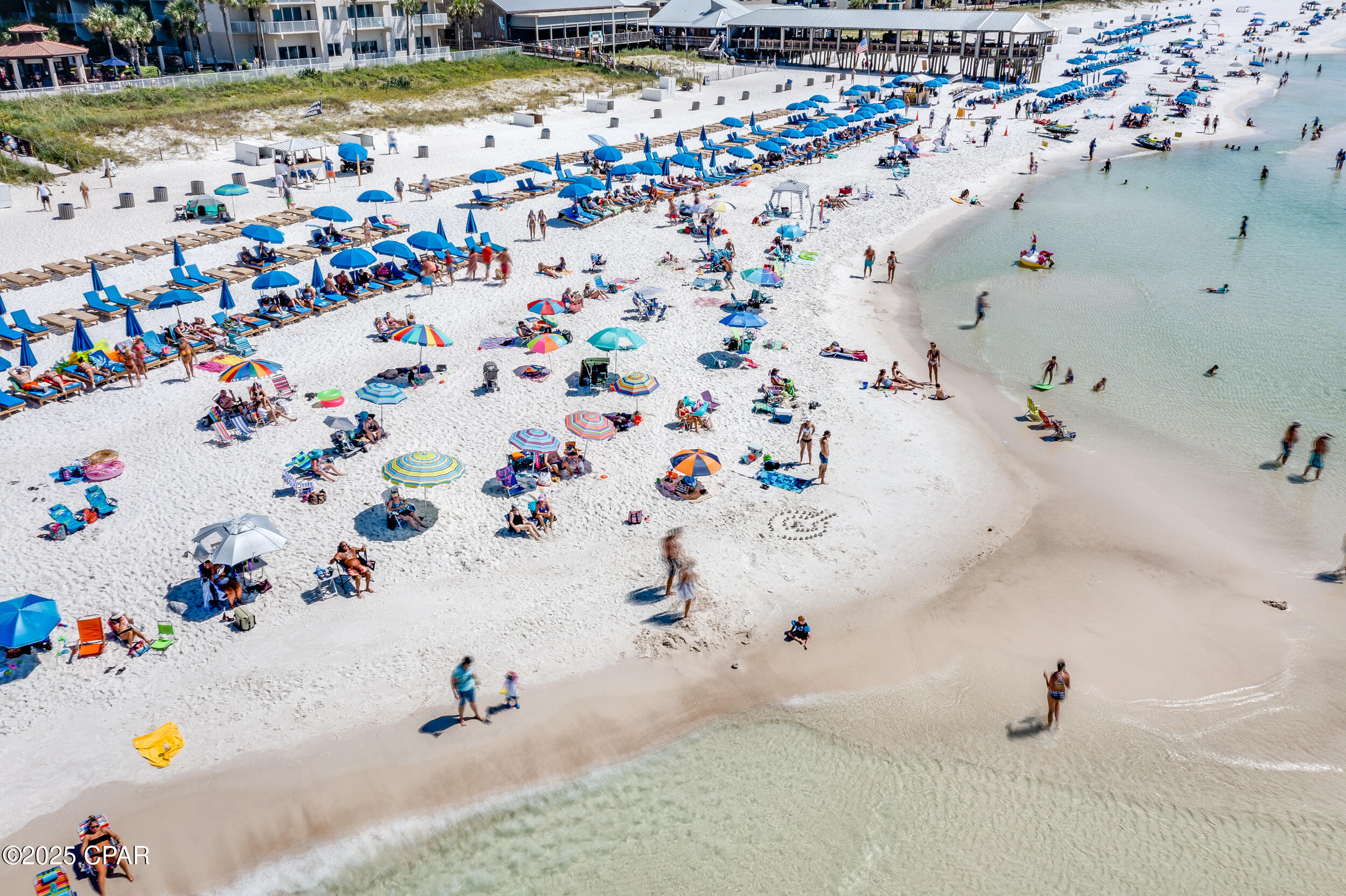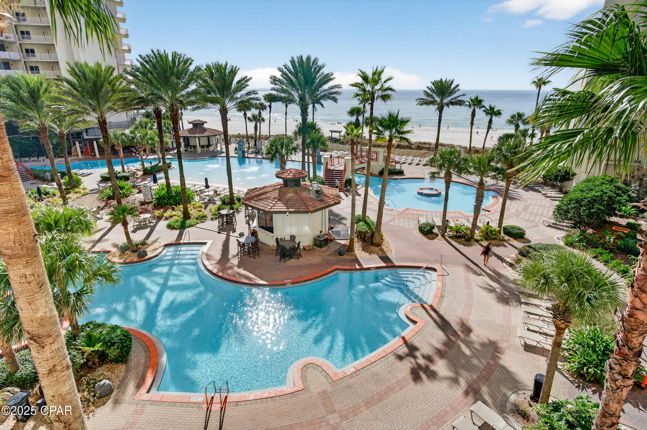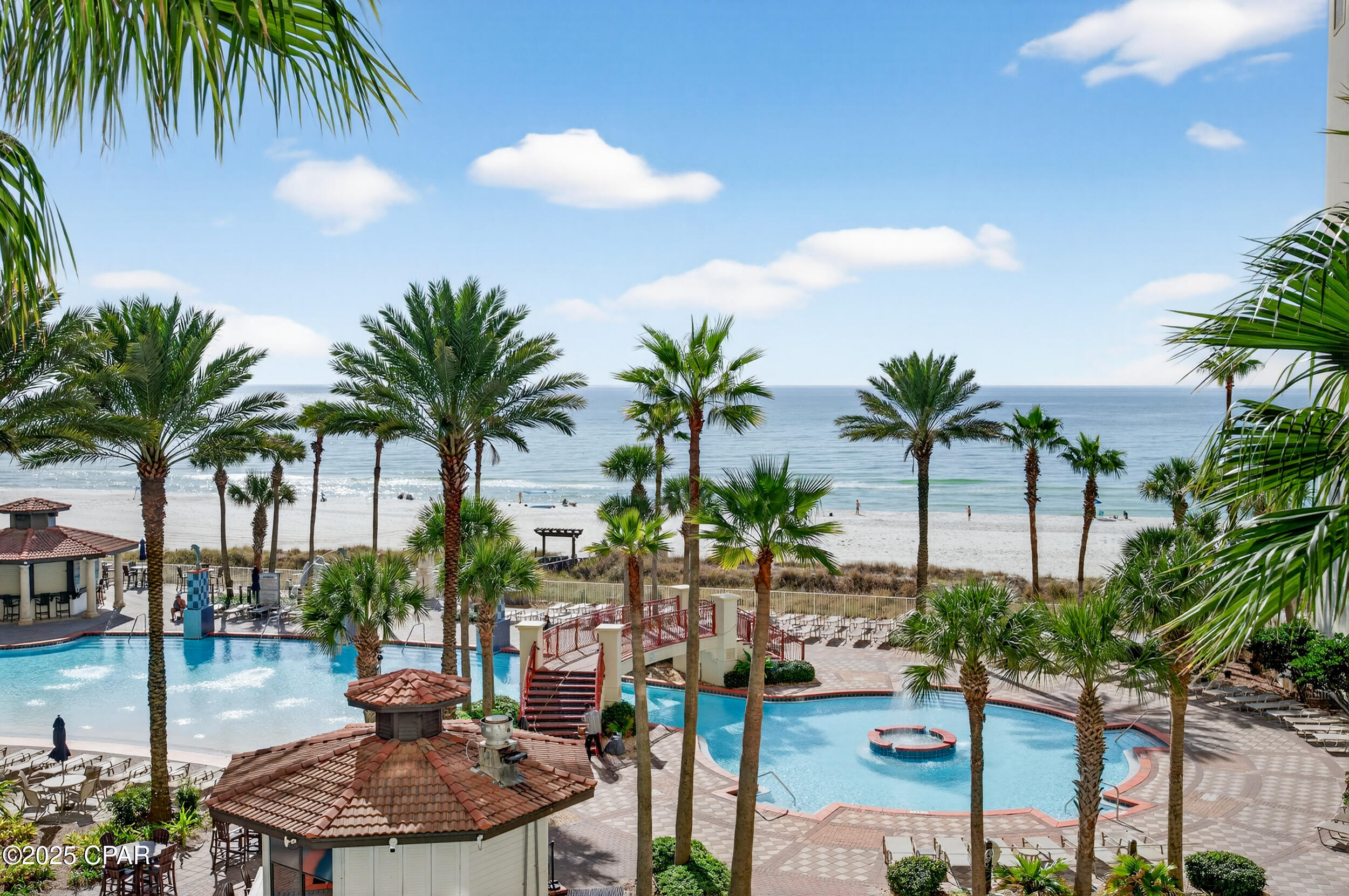 Shores of Panama offers nearly 500 feet of gulf frontage and resort amenities including the largest gulf-front pool on Panama City Beach, indoor and outdoor hot tubs, a seasonally heated indoor pool, fitness center, day spa, tiki bar, sundries store, grilling areas, and covered parking. Walk to dining, shopping, and attractions, with Pineapple Willy's right next door. The HOA covers electricity, cable TV, internet/WiFi, and trash, adding real value and predictability.