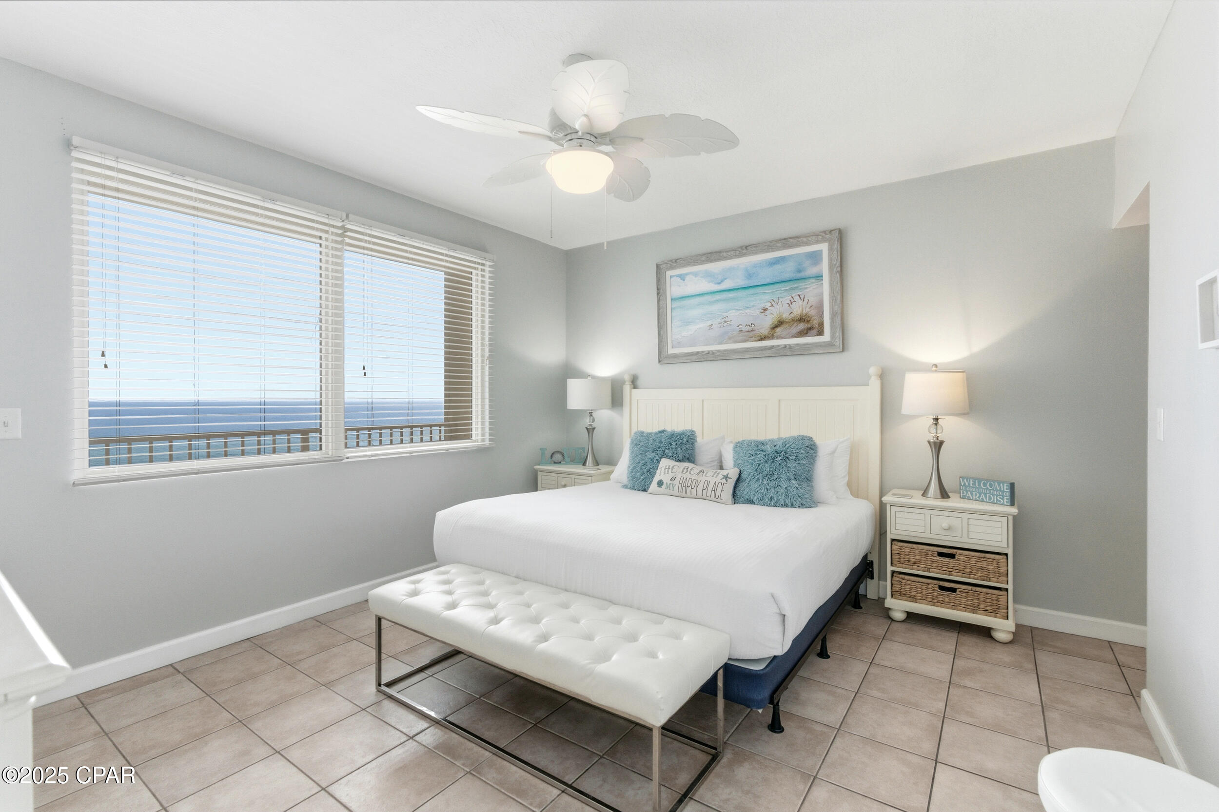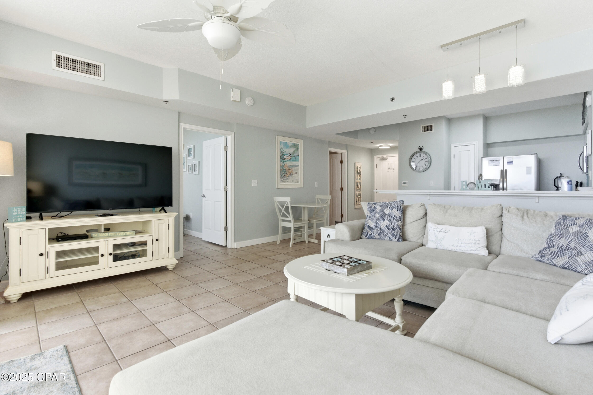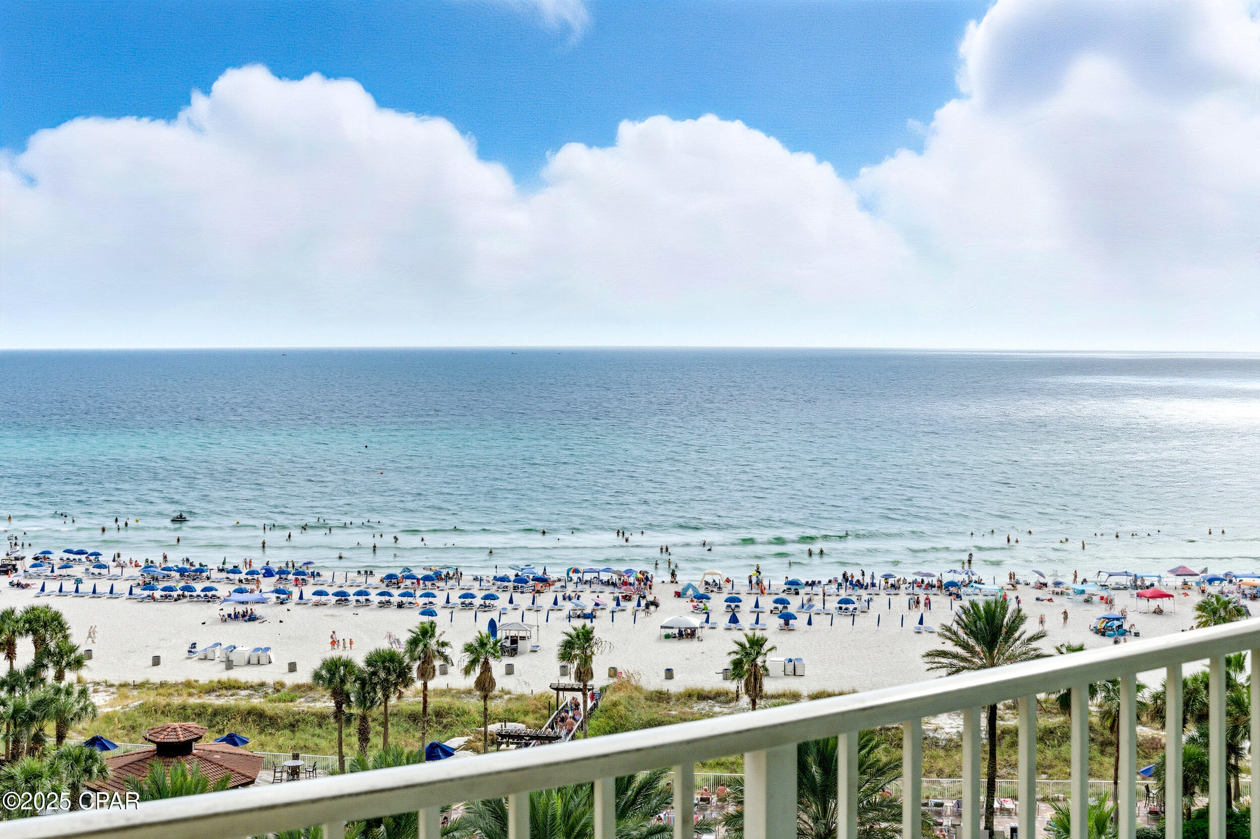 Enjoy stunning gulf views and relaxed coastal living in this 2BR/2BA Shores of Panama condo. This highly popular ''C'' floor plan features floor-to-ceiling windows that fill the space with natural light and open to an extra-wide balcony overlooking the beach and tropical pool. The gulf-front master bedroom has a private ensuite, and the second bedroom plus living area comfortably sleep up to six guests. The bright, modern kitchen offers quartz countertops, white cabinets, a bar counter, and stainless appliances, complemented by tile flooring throughout for easy maintenance. Recent updates include new toilets (March 2025), beds (May 2025), HVAC (July 2025), and stacked washer and dryer (August 2025). The unit comes fully furnished in a relaxed coastal style with one assigned parking spot.