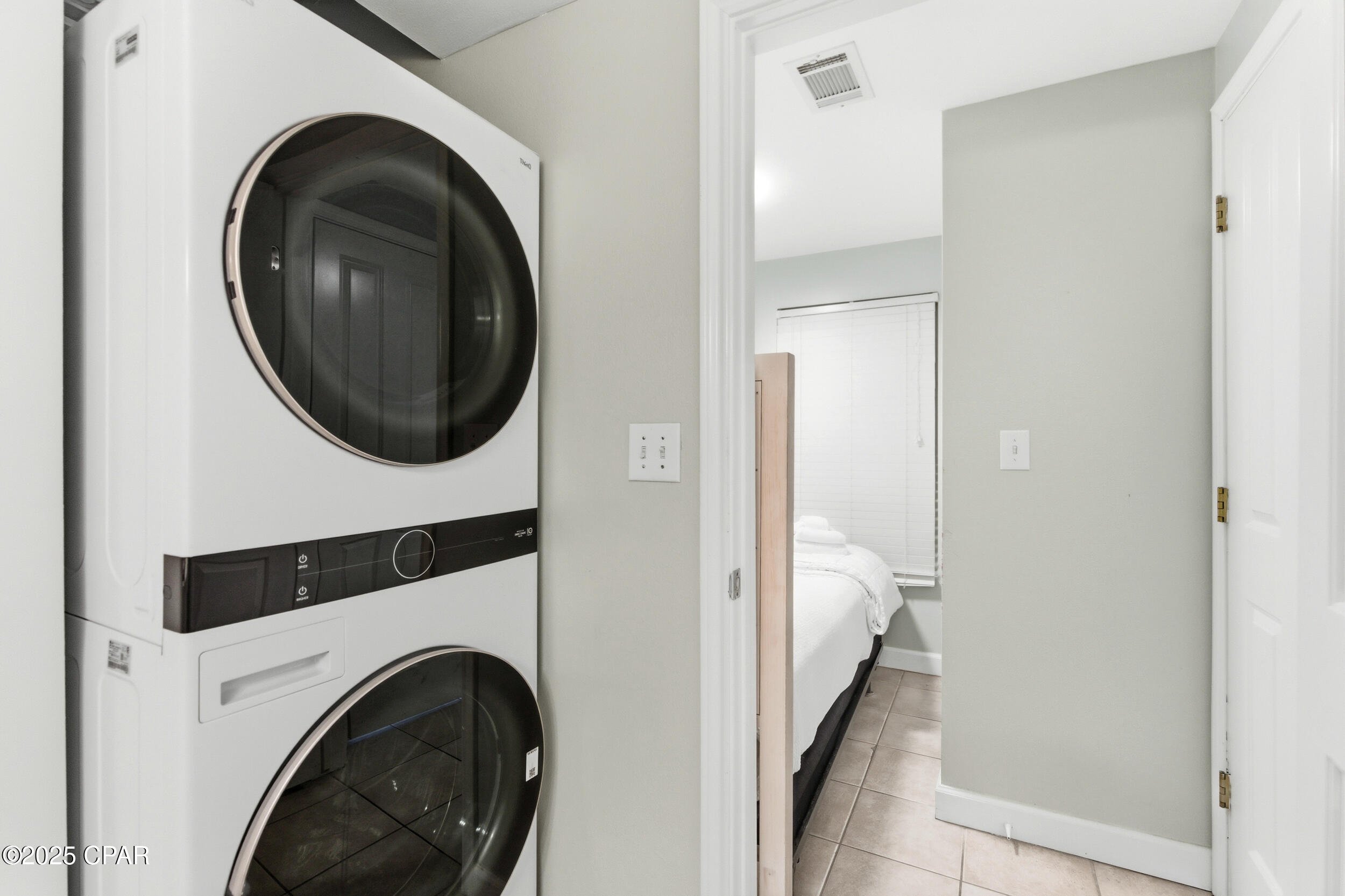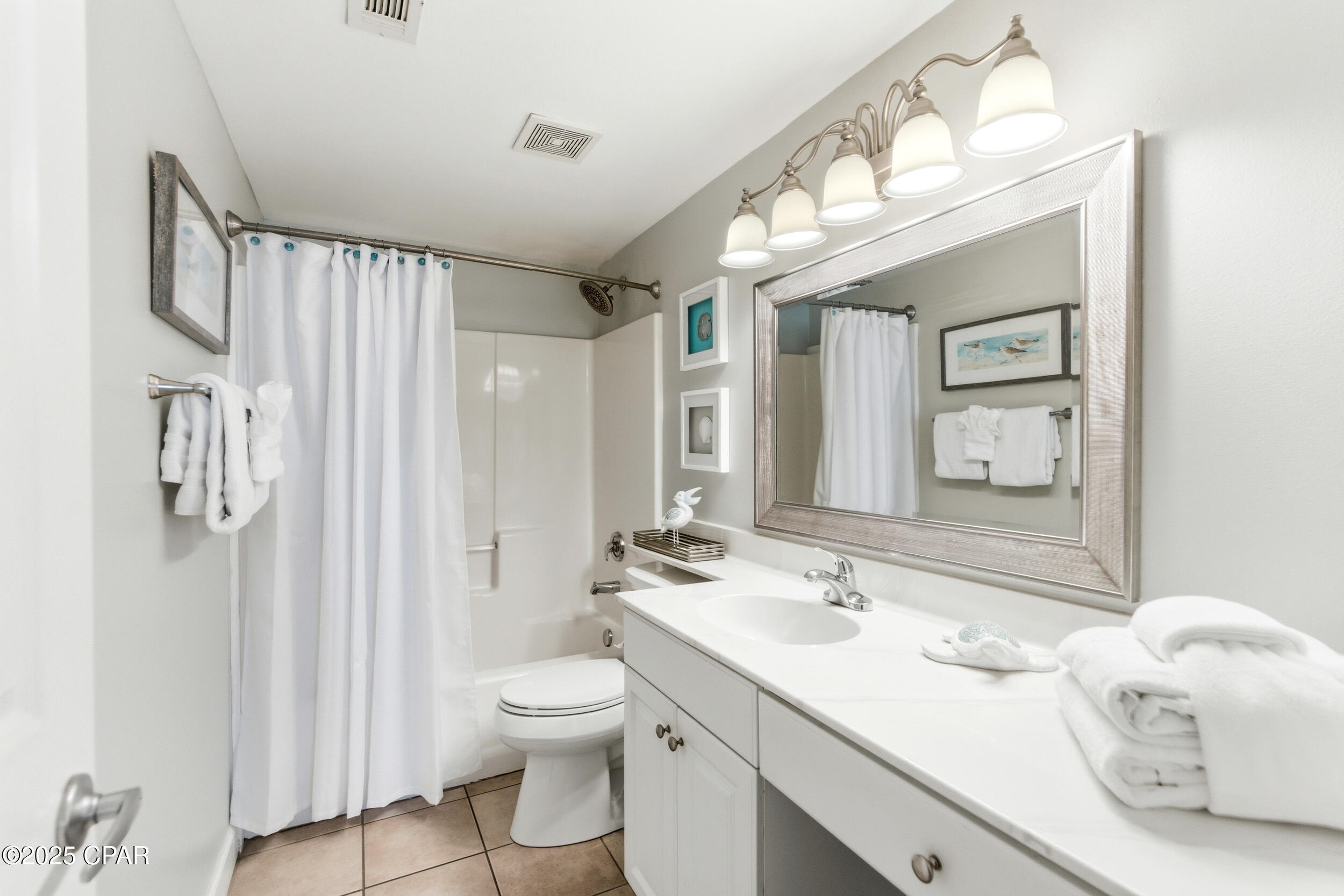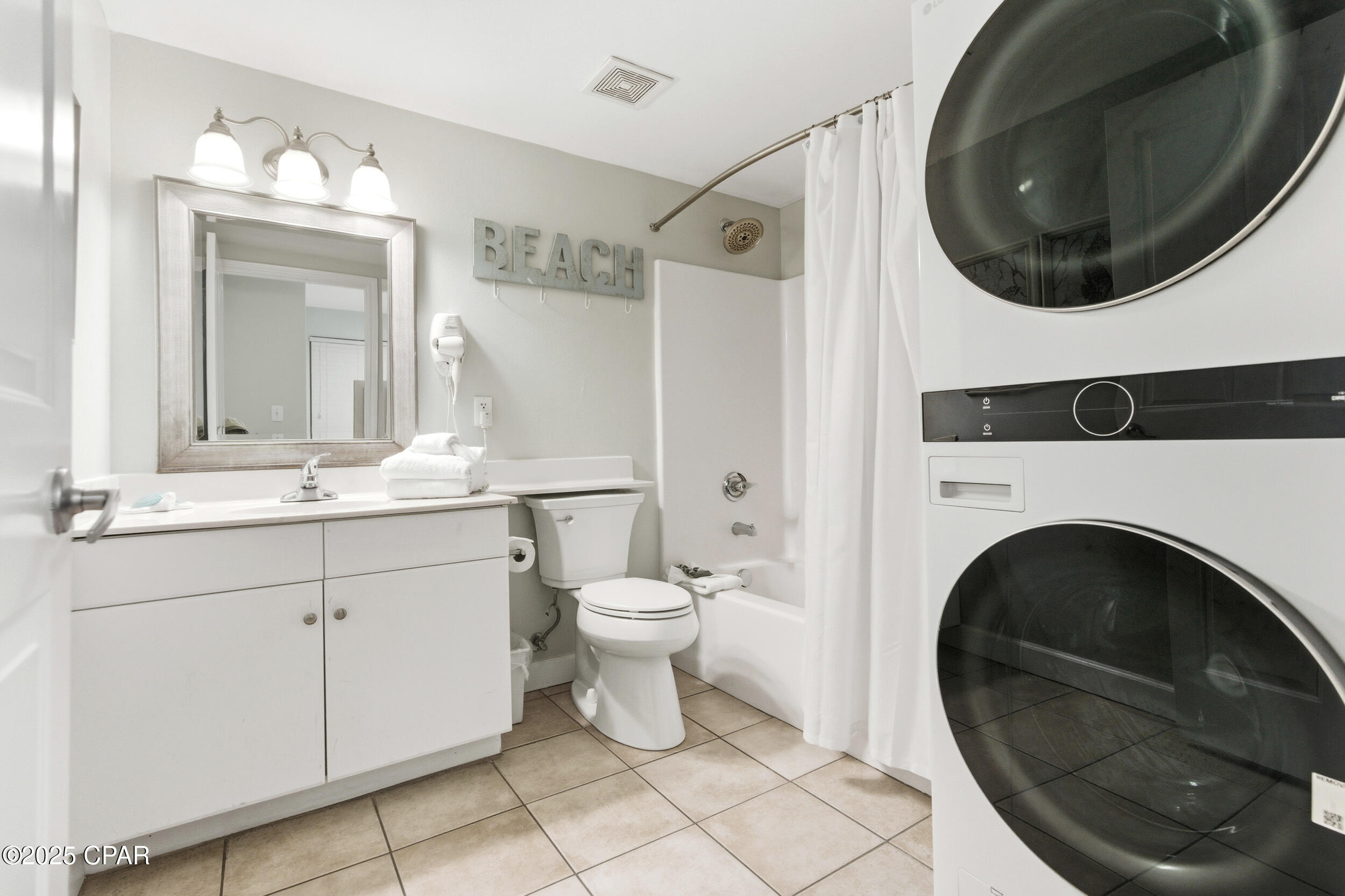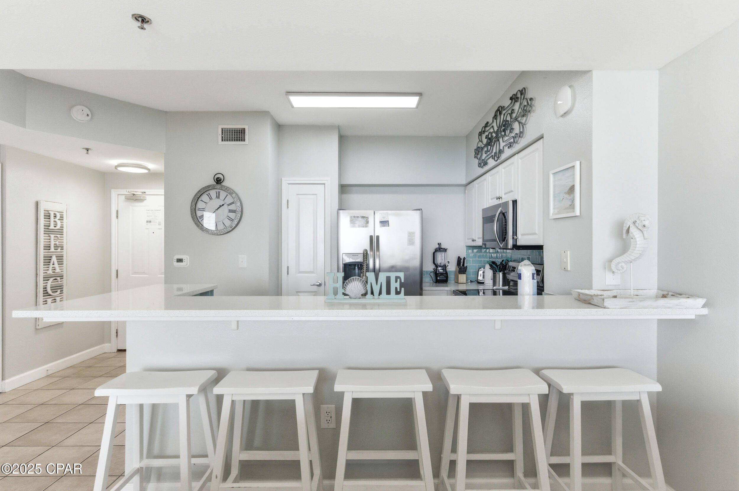 Enjoy stunning gulf views and relaxed coastal living in this 2BR/2BA Shores of Panama condo. This highly popular ''C'' floor plan features floor-to-ceiling windows that fill the space with natural light and open to an extra-wide balcony overlooking the beach and tropical pool. The gulf-front master bedroom has a private ensuite, and the second bedroom plus living area comfortably sleep up to six guests. The bright, modern kitchen offers quartz countertops, white cabinets, a bar counter, and stainless appliances, complemented by tile flooring throughout for easy maintenance. Recent updates include new toilets (March 2025), beds (May 2025), HVAC (July 2025), and stacked washer and dryer (August 2025). The unit comes fully furnished in a relaxed coastal style with one assigned parking spot.